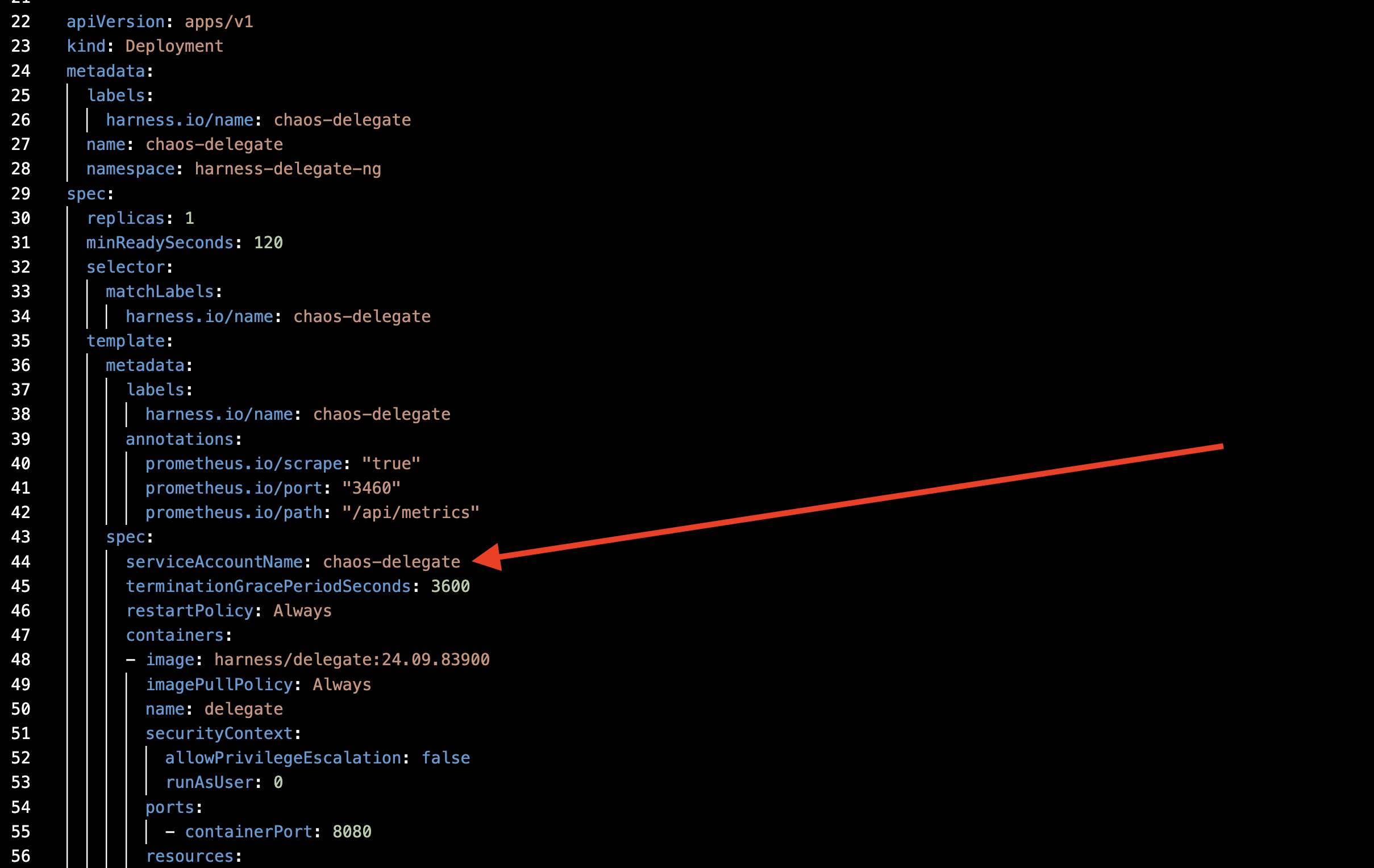 Here, chaos-delegate refers to the name of the service account in the Delegate.