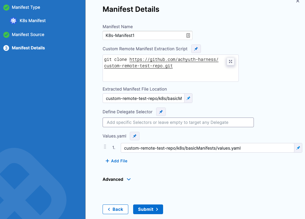 6. In Custom Remote Manifest Extraction Script, enter the path to the Git repo where your remote manifest script is available. This script runs on the Harness Delegate selected for the deployment.