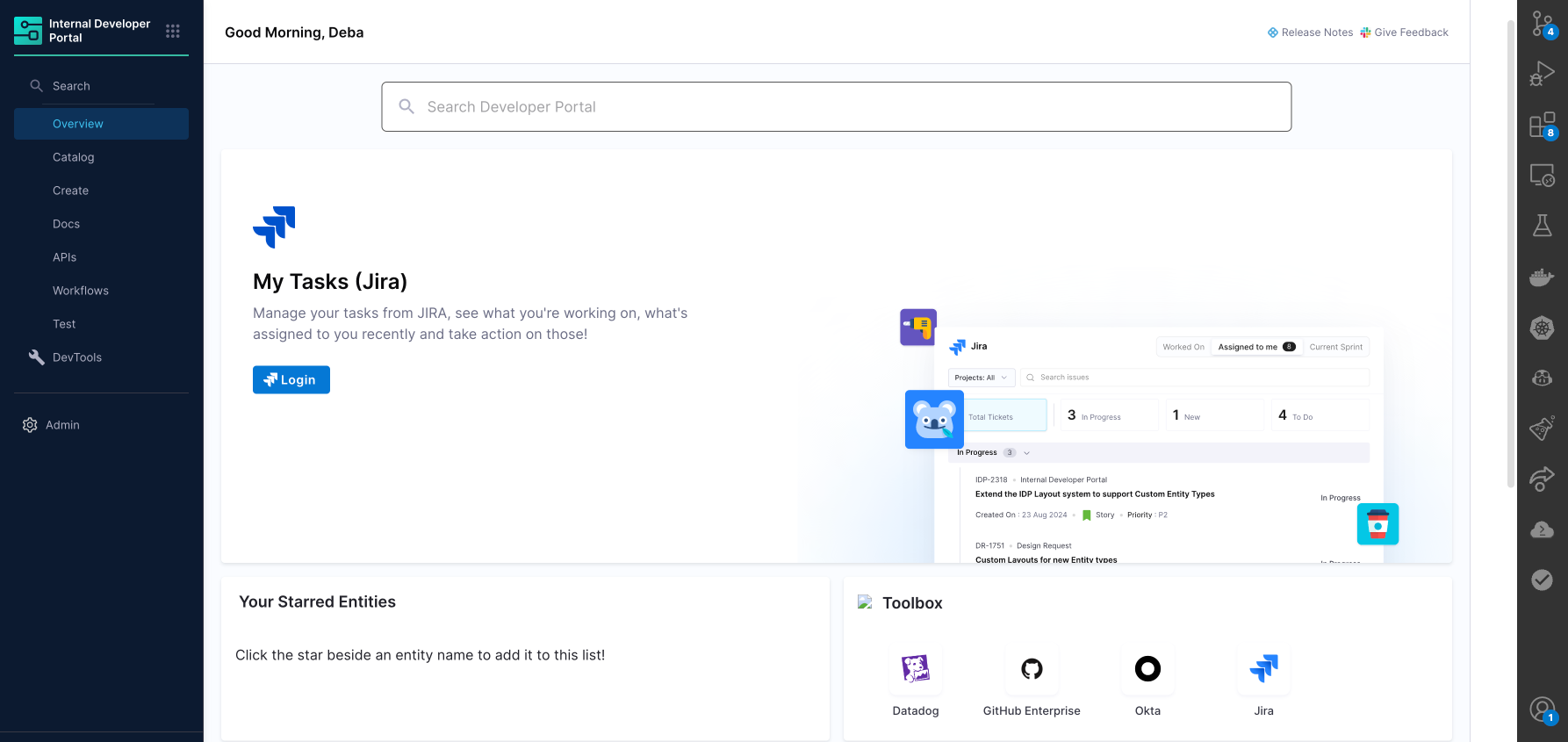 - Starred Entities: Your Starred Components, Workflows or TechDocs are displayed here.