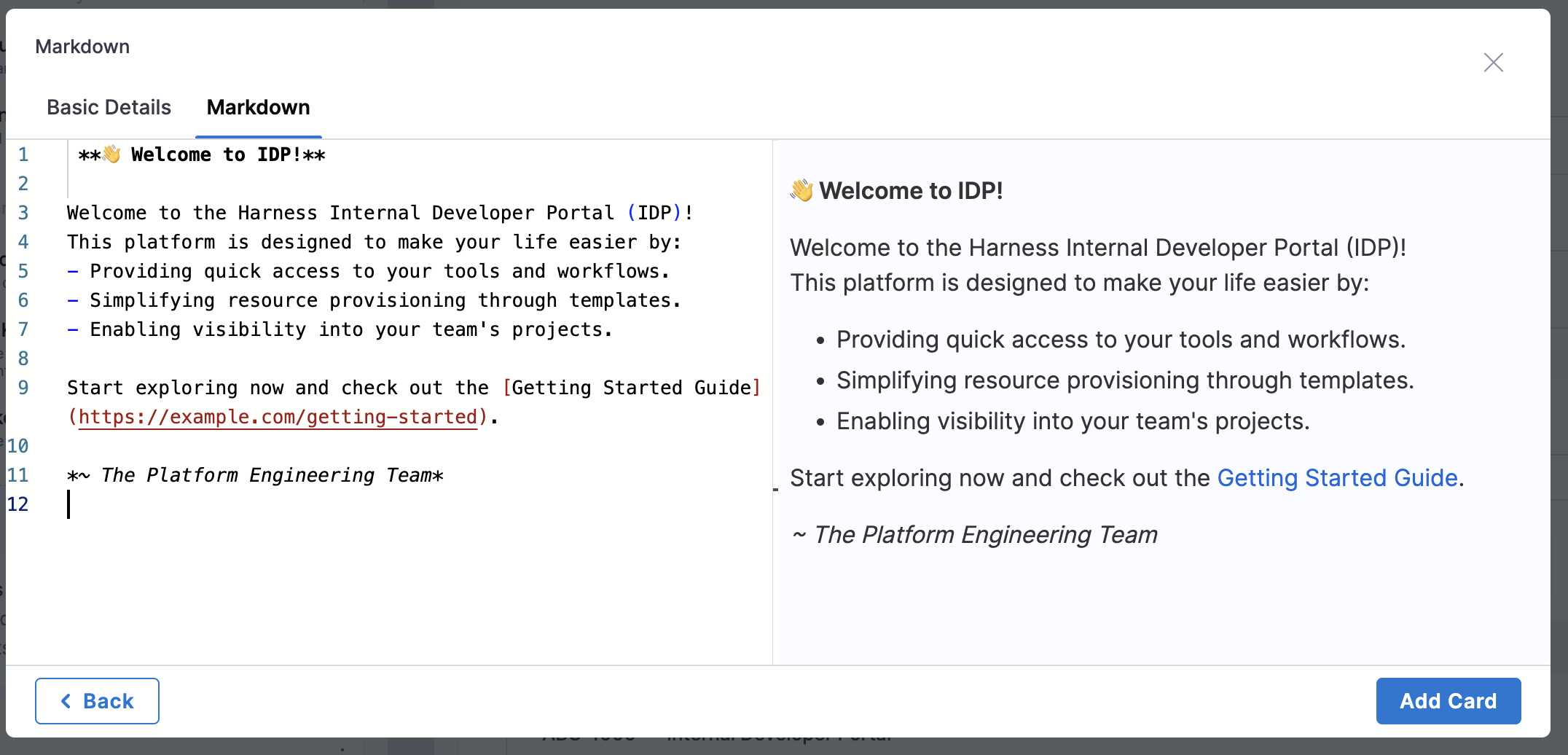 The Markdown Card is a customizable component that supports full markdown syntax, designed to serve various informational purposes on the IDP Homepage. Here's an example of Engineering Handbook card.